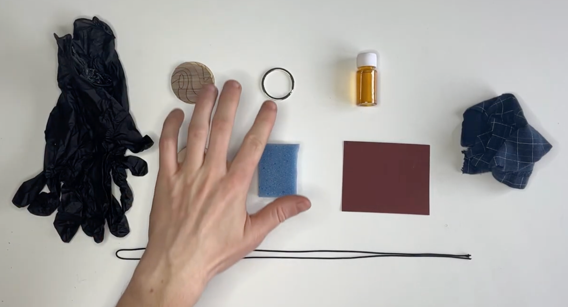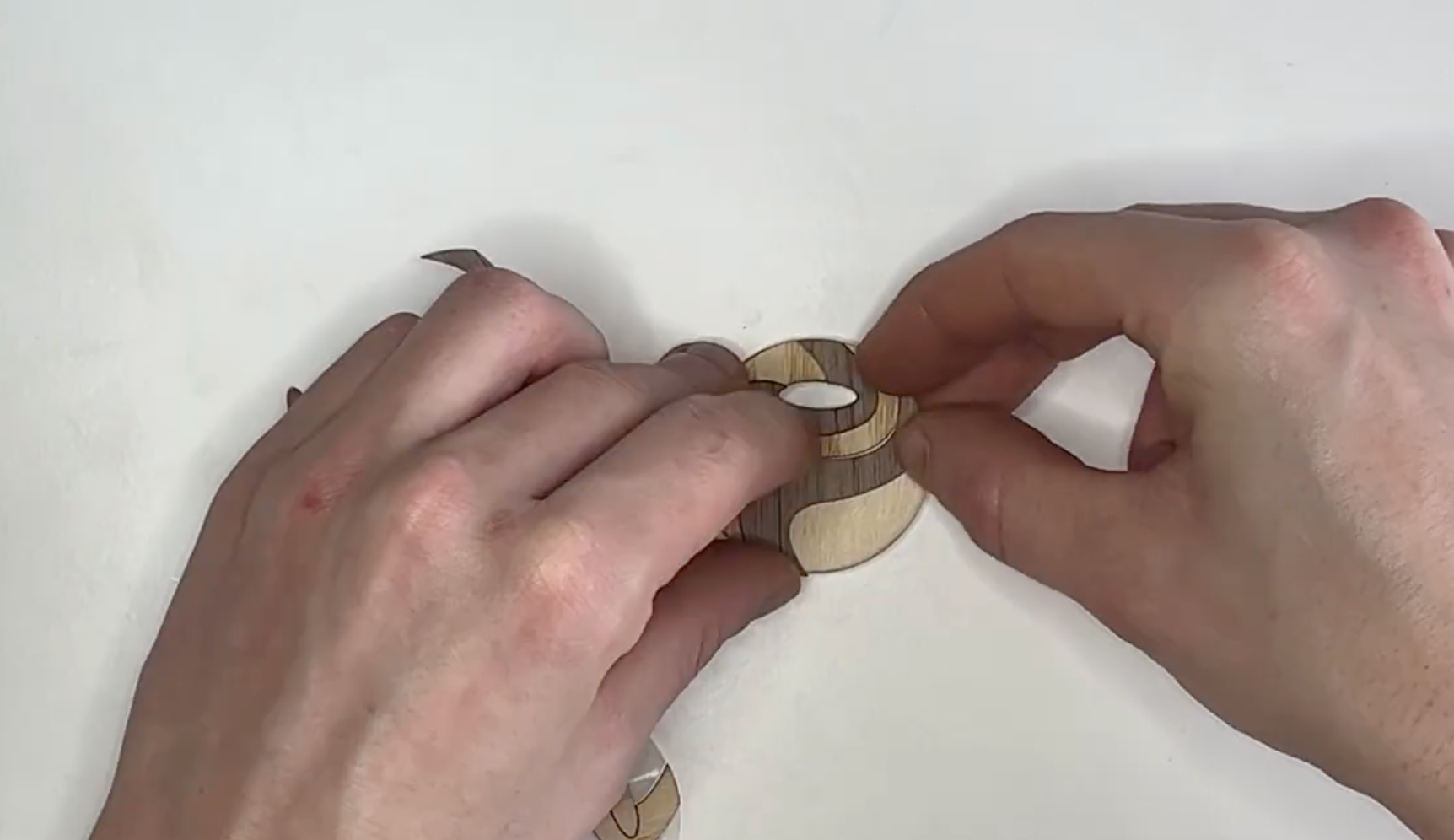Pour construire votre porte-clef, vous devrez appliquer la marqueterie sur votre pièce de bois, poncer, vernir et tresser la corde entre l'anneau et la pièce de bois.